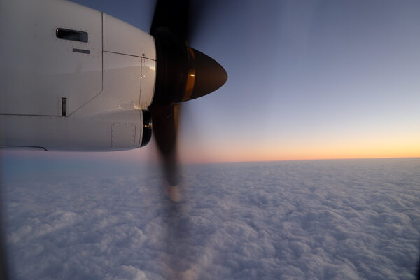 フライトレベルは22000フィートとの事で夕日の残光が輝きを見ながら南下します。座席がちょうどエンジンの横でプロペラの回る様子が良く見えます。