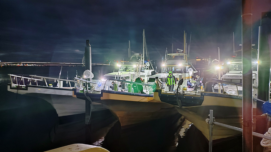 フグ船は2隻出しですが、既に空いている場所は少なく、1号船の右舷胴の間4番目に荷物を置いてから受付を済まします。
