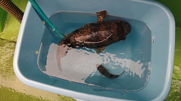 これは・・・巻き上げると茶色の物体が見えて良型のアカメフグです。一気に引き上げてようやく1匹ゲットです。