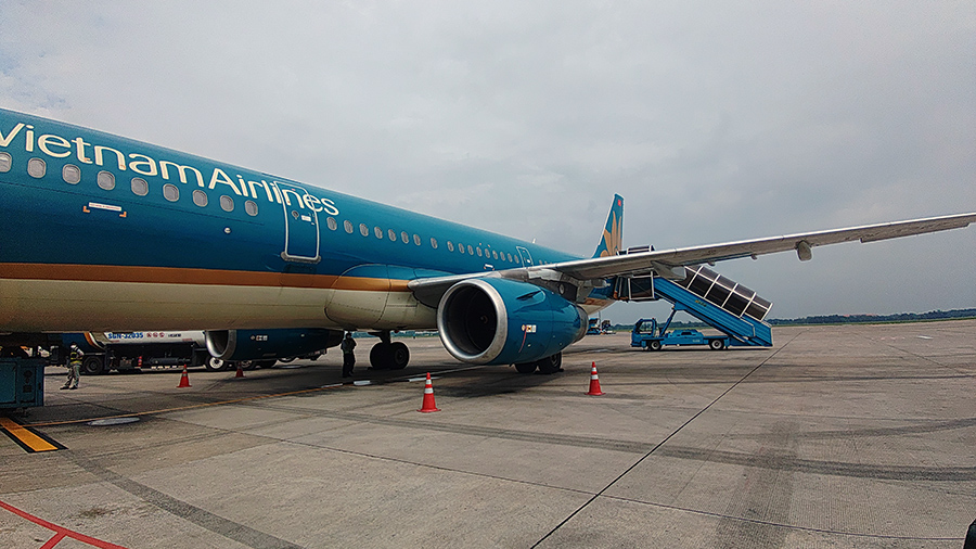 8:40から搭乗が始まり、ビジネスなので専用バスに乗り込みシップに向かいます。どこに居るのかなと行き交うグラハンの車を見ながら進むと、国内線ターミナルの駐機場へ向かいます。国内線の間合い運用後なのでしょうかね。ボーディングブリッジが外されステップ車が横付けされているVN-A335がVN402でした。