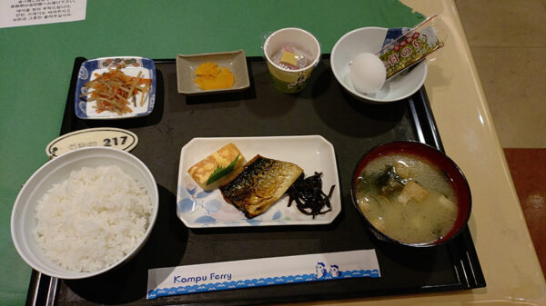 流石に関門海峡に出ると北風が強くなって寒いので船内に戻り、そろそろ食事の時間だなとレストランに行くと既に営業が始まっていて券売機で食券を買うとすると、お目当てのハンバーク定食が売切れになってます。